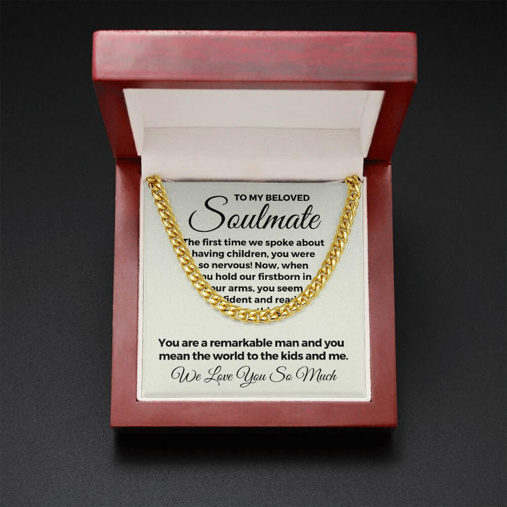 Surprise your soulmate with a timeless and stylish Cuban Link Chain necklace that he can wear with almost anything - a perfect gift for a new dad! Our Cuban link necklace is available in polished stainless steel and in a 14k yellow gold over stainless steel finish. The Cuban link necklace has an adjustable chain that measures 18" - 22" and fastens with a parrot clasp to keep it secure. This beautiful necklace is also one of the best unique birthday gift ideas because it comes in a luxury wooden gift box that features a LED light with a sweet, heartfelt message that will surely make your husband feel loved and appreciated!