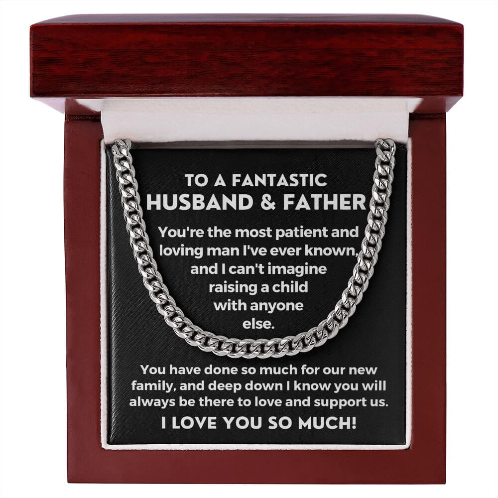 Surprise your husband with a timeless and stylish Cuban Link Chain necklace that he can wear with almost anything - a perfect gift for a new dad! Our Cuban link necklace is available in polished stainless steel and in a 14k yellow gold over stainless steel finish. The Cuban link necklace has an adjustable chain that measures 18" - 22" and fastens with a parrot clasp to keep it secure. This beautiful necklace is also one of the best unique birthday gift ideas because it comes in a luxury wooden gift box that features a LED light with a sweet, heartfelt message that will surely make your husband feel loved and appreciated!