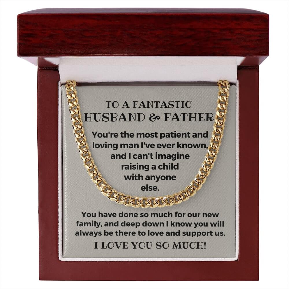 Surprise your husband with a timeless and stylish Cuban Link Chain necklace that he can wear with almost anything - a perfect gift for a new dad! Our Cuban link necklace is available in polished stainless steel and in a 14k yellow gold over stainless steel finish. The Cuban link necklace has an adjustable chain that measures 18" - 22" and fastens with a parrot clasp to keep it secure. This beautiful necklace is also one of the best unique birthday gift ideas because it comes in a luxury wooden gift box that features a LED light with a sweet, heartfelt message that will surely make your husband feel loved and appreciated!