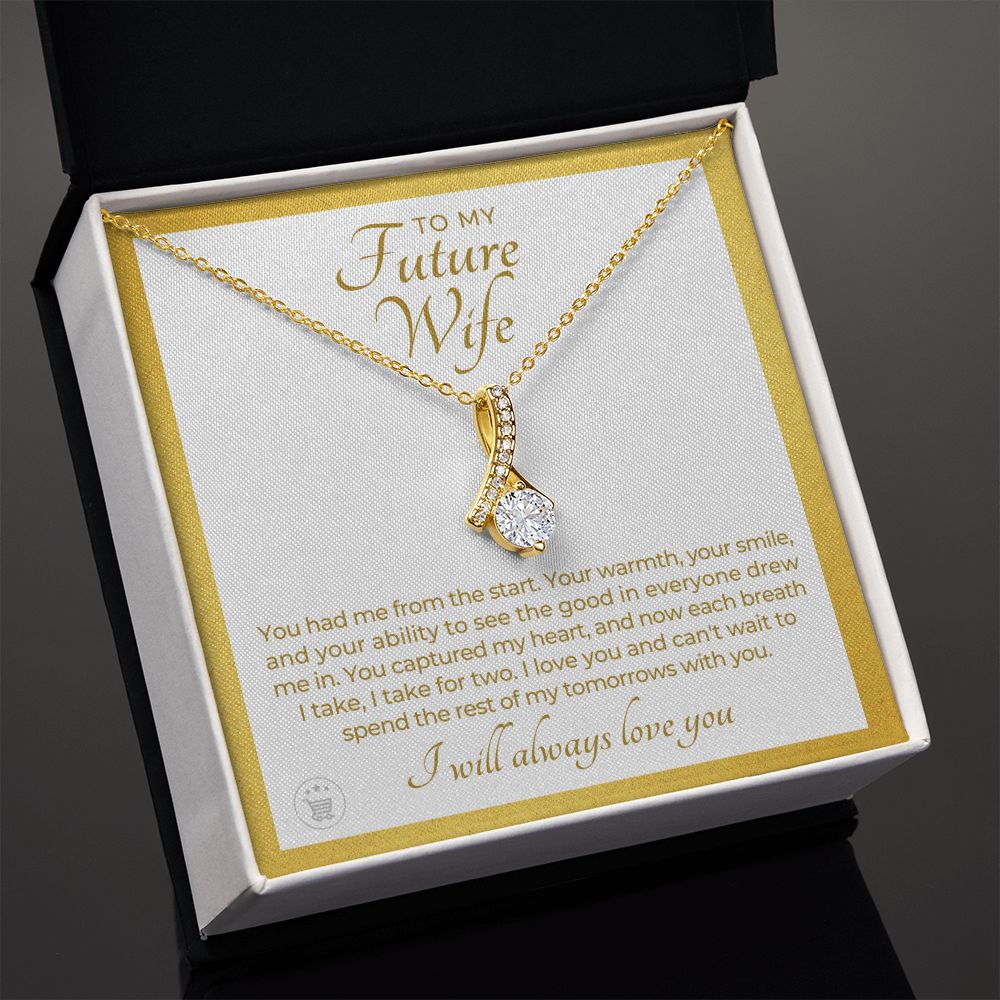 If you’re looking for a unique and special gift to give your future wife on a special occasion, then look no further! This beautiful necklace is crafted with love and thoughtfulness. The pendant necklace comes in an elegant gift box with a sweet message that will surely make your future wife feel loved and appreciated!