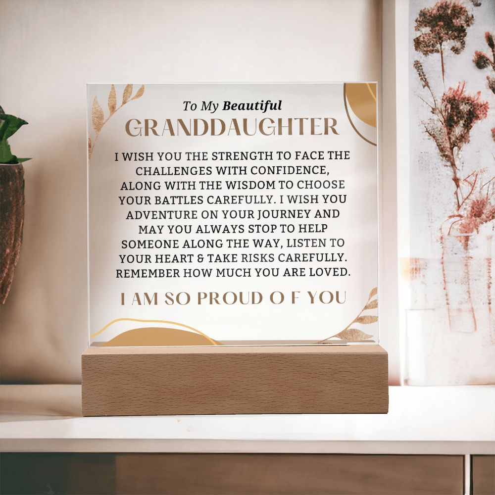 Captivate your granddaughter's heart with our Square Acrylic Plaque - a modern masterpiece that exudes love and admiration! Crafted from premium crystal-clear acrylic, this striking design effortlessly commands attention in any space. Upgrade to the LED wooden base for an unforgettable experience and create everlasting memories she'll cherish forever. This is more than just a gift – it's a treasure that speaks volumes, creating a lasting impression and becoming a cherished keepsake for years to come.