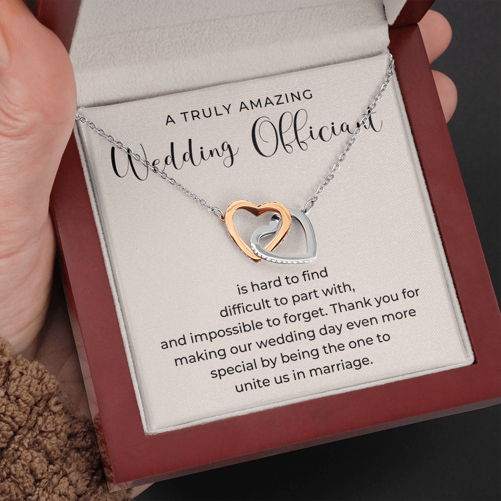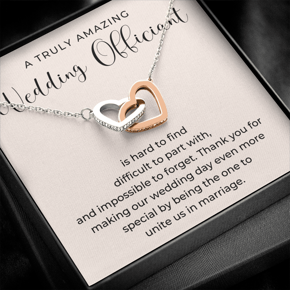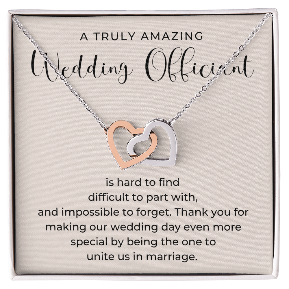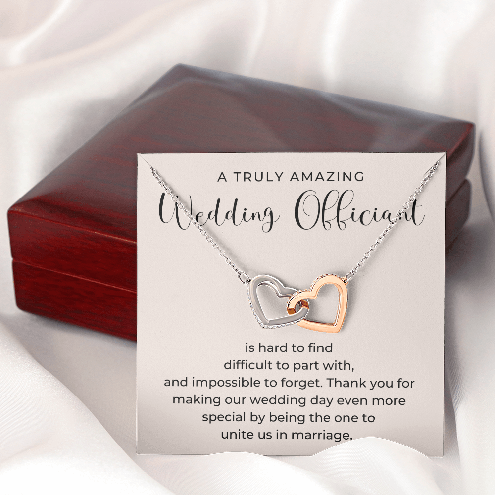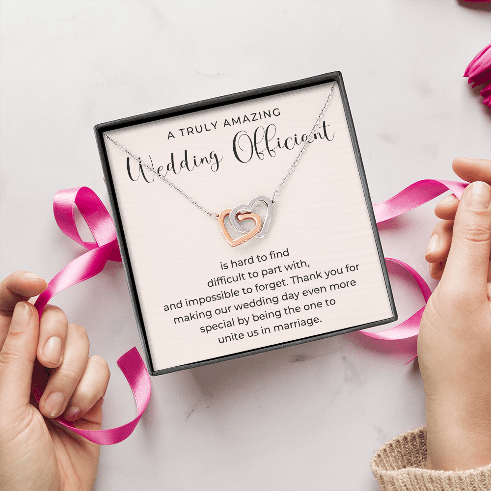 Are you looking for a unique gift to ask someone to be your wedding officiant or to thank the best wedding officiant ever for uniting you in marriage? The small pendant necklace features polished stainless steel and rose gold hearts interlocked together and embellished with cubic zirconia stones, adding extra sparkle and shine. Our pendant necklace comes in an elegant gift box with a sweet message that will surely make your wedding officiant feel loved and appreciated!