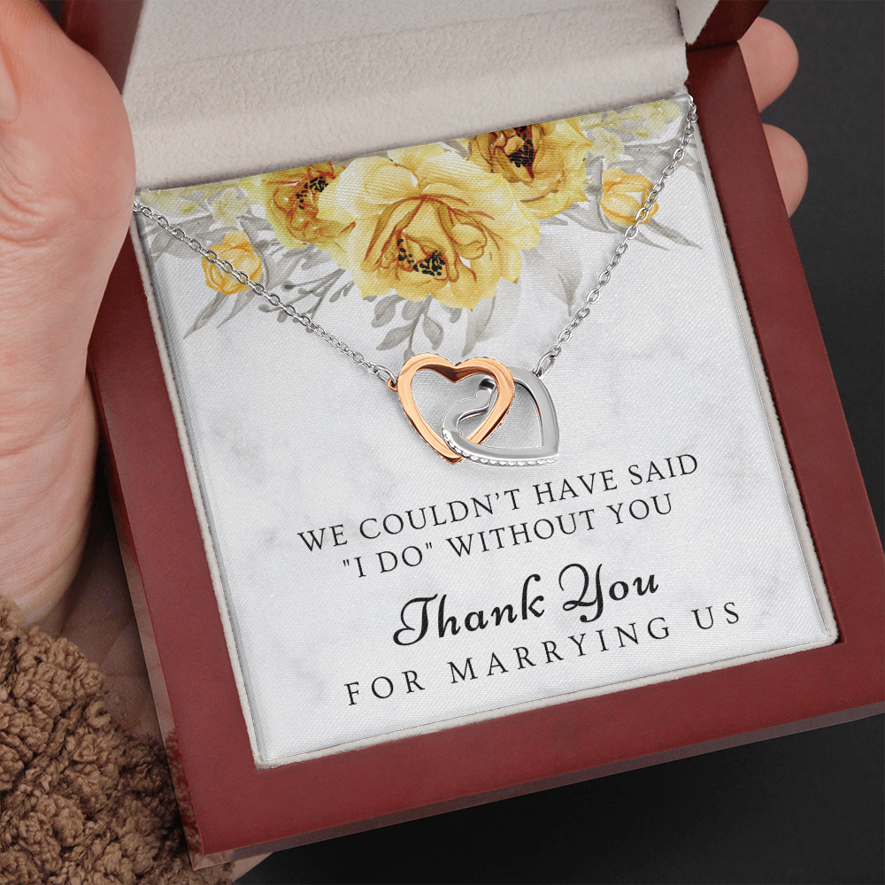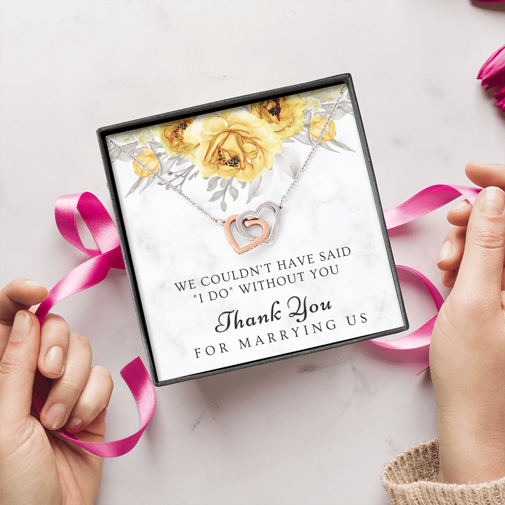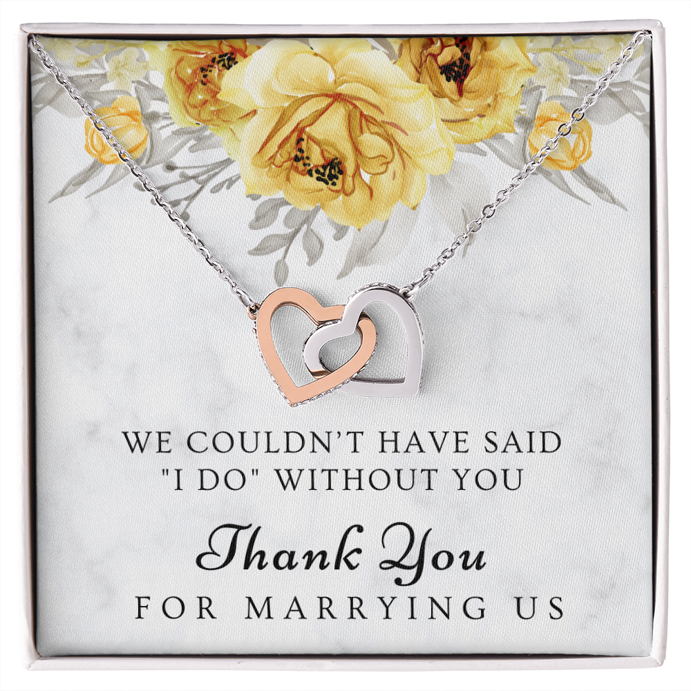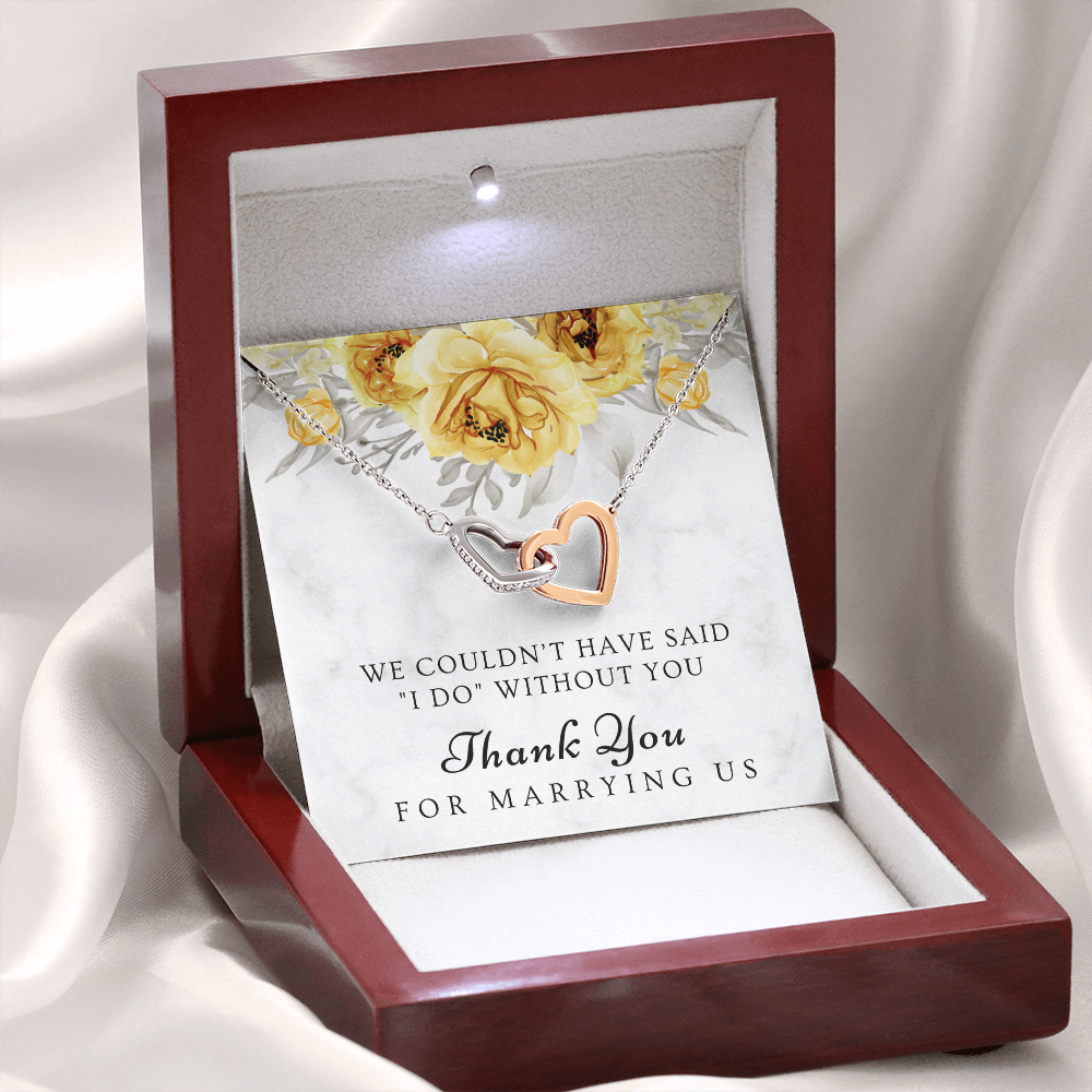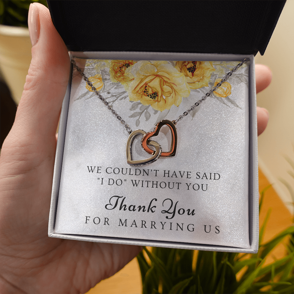 Are you looking for a unique gift to ask someone to be your wedding officiant or to thank the best wedding officiant ever for uniting you in marriage? The small pendant necklace features polished stainless steel and rose gold hearts interlocked together and embellished with cubic zirconia stones, adding extra sparkle and shine. Our pendant necklace comes in an elegant gift box with a sweet message that will surely make your wedding officiant feel loved and appreciated!