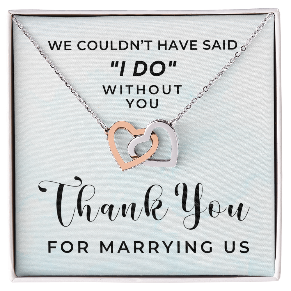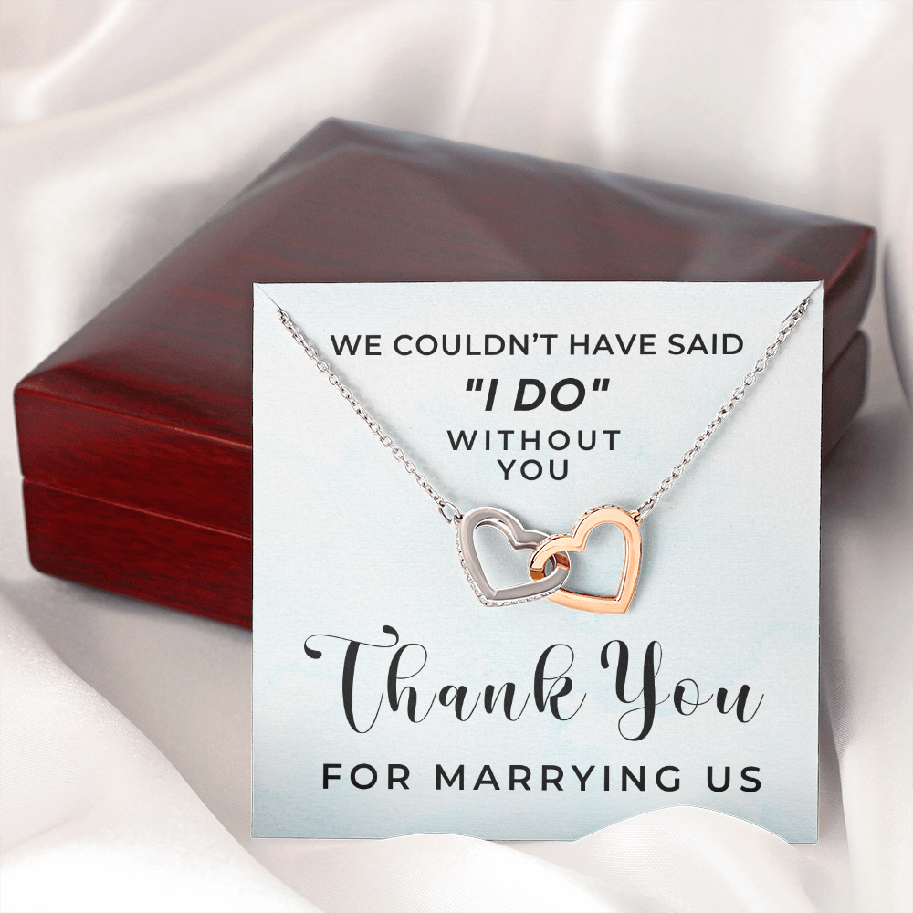 Are you looking for a unique gift to ask someone to be your wedding officiant or to thank the best wedding officiant ever for uniting you in marriage? The small pendant necklace features polished stainless steel and rose gold hearts interlocked together and embellished with cubic zirconia stones, adding extra sparkle and shine. Our pendant necklace comes in an elegant gift box with a sweet message that will surely make your wedding officiant feel loved and appreciated!