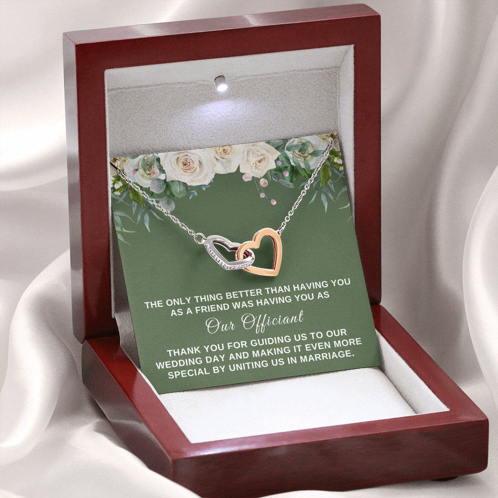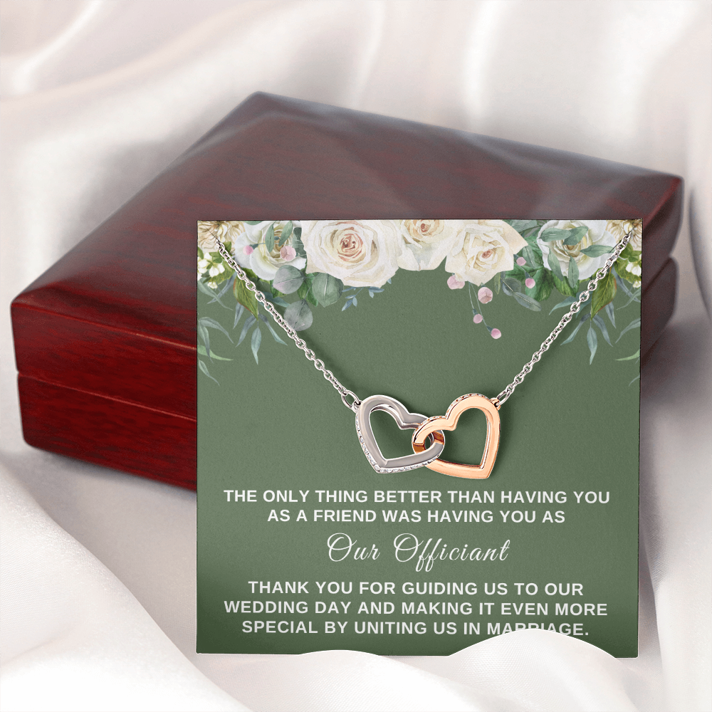 Are you looking for a unique gift to ask someone to be your wedding officiant or to thank the best wedding officiant ever for uniting you in marriage? The small pendant necklace features polished stainless steel and rose gold hearts interlocked together and embellished with cubic zirconia stones, adding extra sparkle and shine. Our pendant necklace comes in an elegant gift box with a sweet message that will surely make your wedding officiant feel loved and appreciated!
