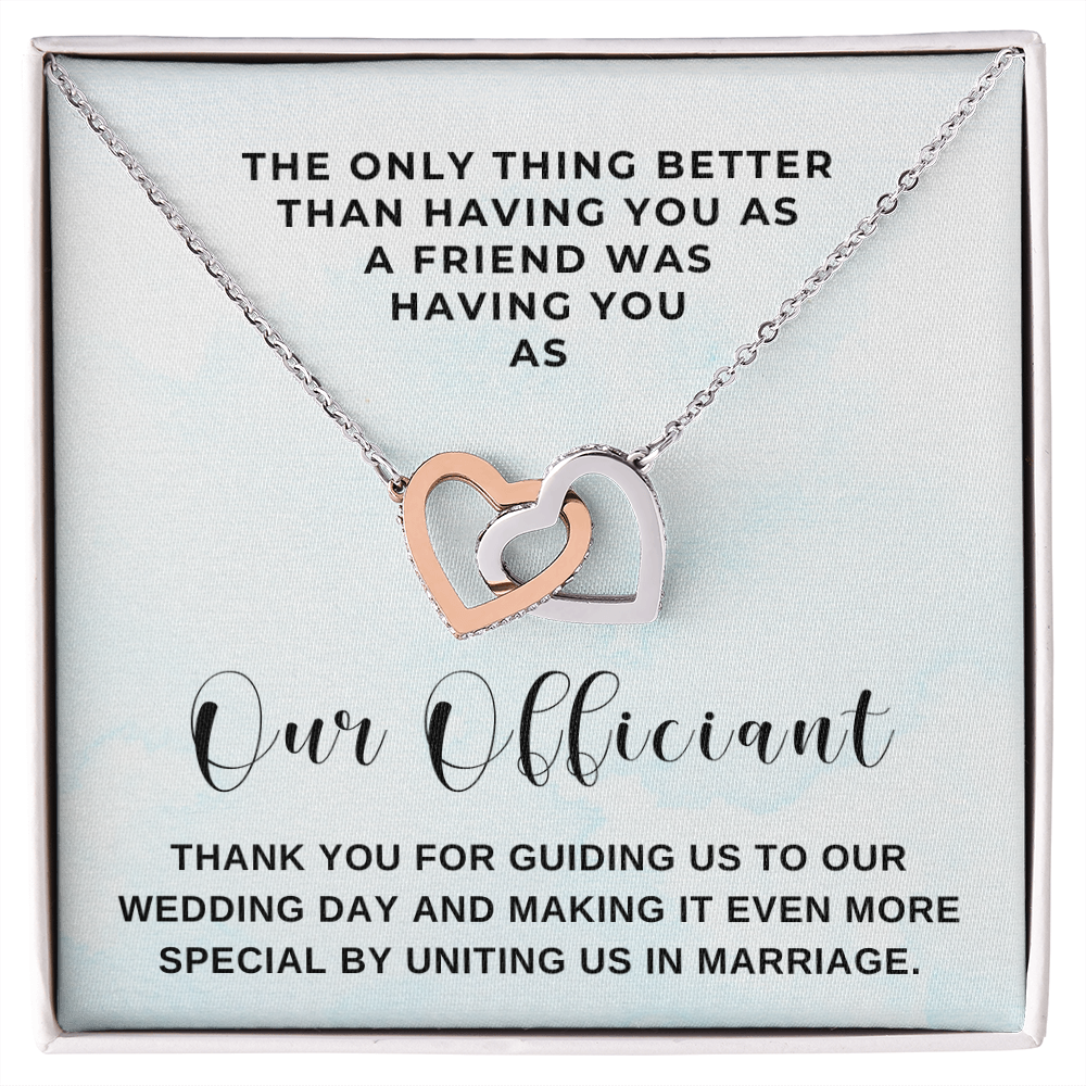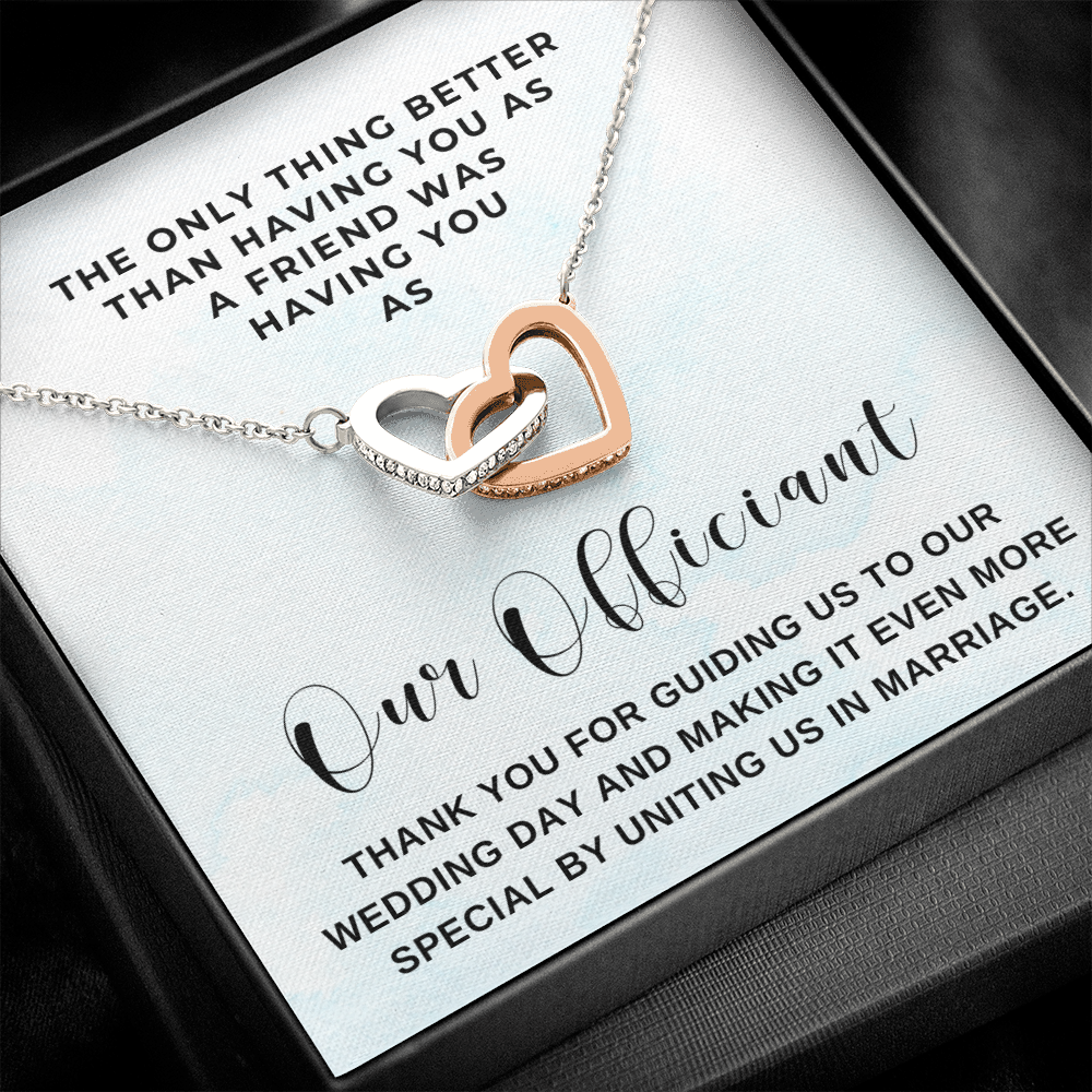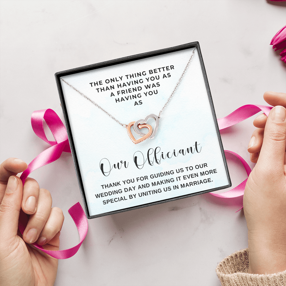 Are you looking for a unique gift to ask someone to be your wedding officiant or to thank the best wedding officiant ever for uniting you in marriage? The small pendant necklace features polished stainless steel and rose gold hearts interlocked together and embellished with cubic zirconia stones, adding extra sparkle and shine. Our pendant necklace comes in an elegant gift box with a sweet message that will surely make your wedding officiant feel loved and appreciated!
