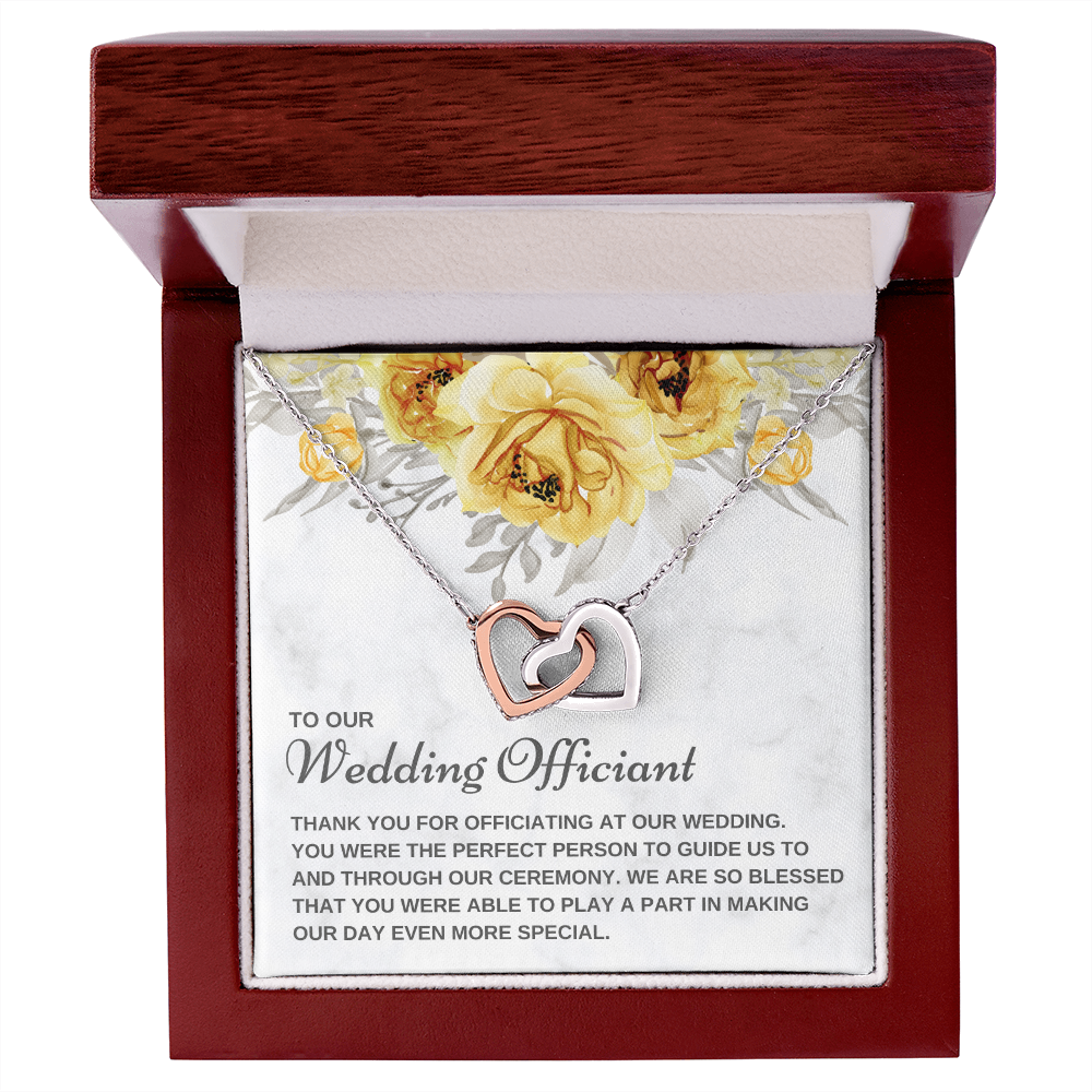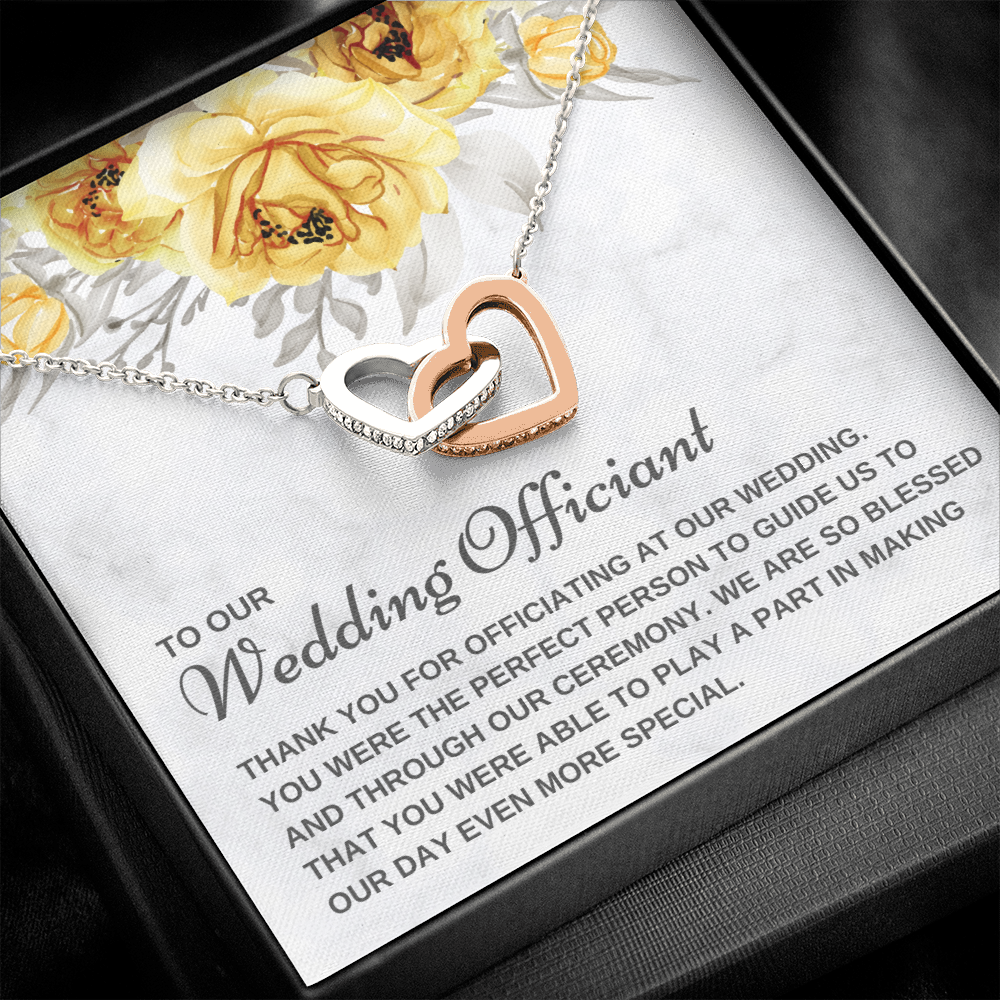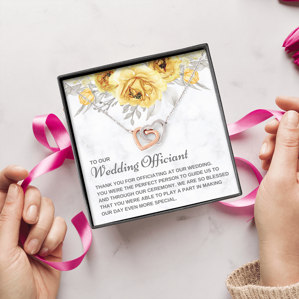 Are you looking for a unique gift to ask someone to be your wedding officiant or to thank the best wedding officiant ever for uniting you in marriage? The small pendant necklace features polished stainless steel and rose gold hearts interlocked together and embellished with cubic zirconia stones, adding extra sparkle and shine. Our pendant necklace comes in an elegant gift box with a sweet message that will surely make your wedding officiant feel loved and appreciated!